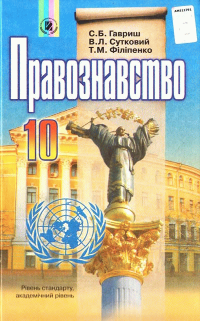 Правознавство. Рівень стандарту, академічний рівень [Текст] : підручник : для 10 класу загальноосвітніх навчальних закладів. / С. Б. Гавриш, В. Л. Сутковий, Т. М. Філіпенко